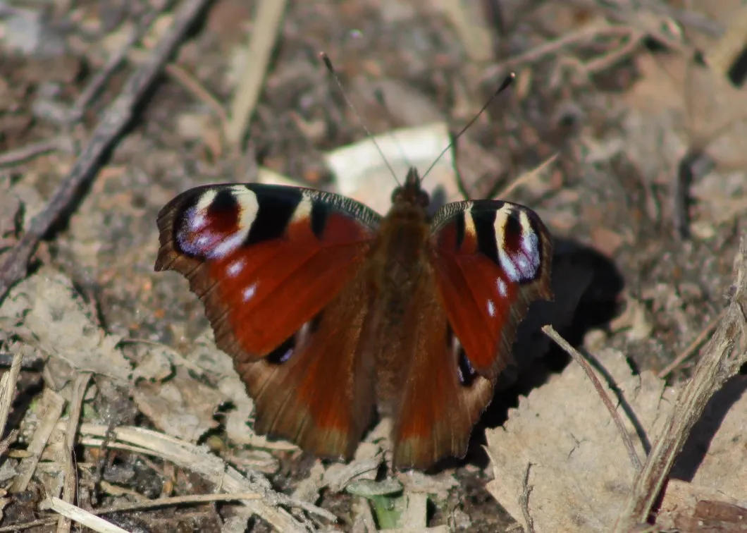 На окраине города, границе с лесом можно увидеть успешно пережившую зиму и начавшую свой весенний лёт бабочку павлиний глаз. На фоне серого весеннего ландшафта появление красочного насекомого вызывает удивление и восхищение яркими неземными цветами. Чудо удалось увидеть всего минуту, затем она резко взлетела и исчезла в прошлогодних зарослях сорных лесных растений. Павлиний глаз обитает в местах где произрастают травы: крапива, лопух войлочный, чертополох.