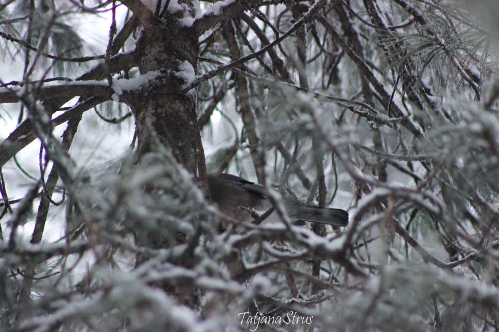 Где-то в верхушках деревьев начинает перелетать сойка, она долго будет ждать когда человек уйдет, только потом спуститься к кормушке. Сойку мелким птицам необходимо остерегаться, поэтому, завидев ее, птицы начинают подавать голосовые тревожные сигналы, особенно в этих тревожных сигналах слышен голос поползня, он непрерывный и громкий.