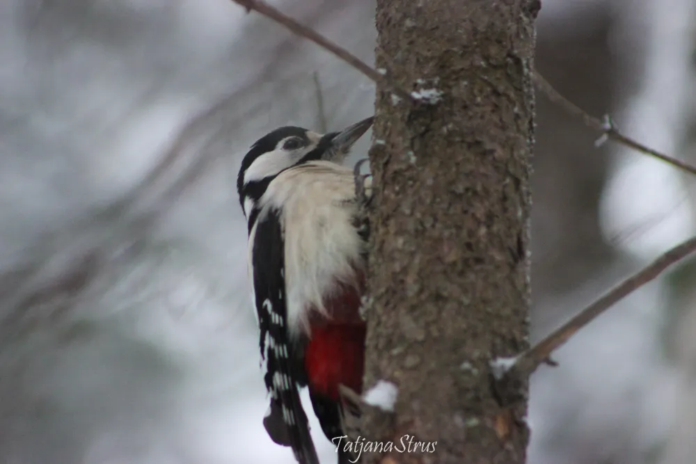 Издалека обычно прилетает большой пестрый дятел, вначале делает вид, что кормушка его не интересует, затем, прячась за стволами деревьев, подлетает все ближе и ближе к кормушке. Садится на снег и скачками передвигается к кедровой шишке, унести её не может, поэтому склевывает орех, улетает с ним к соседней кузнице и возвращается за следующей порцией ореха. Мелкие птицы, хоть и косятся на дятла, но не боятся его и не улетают.