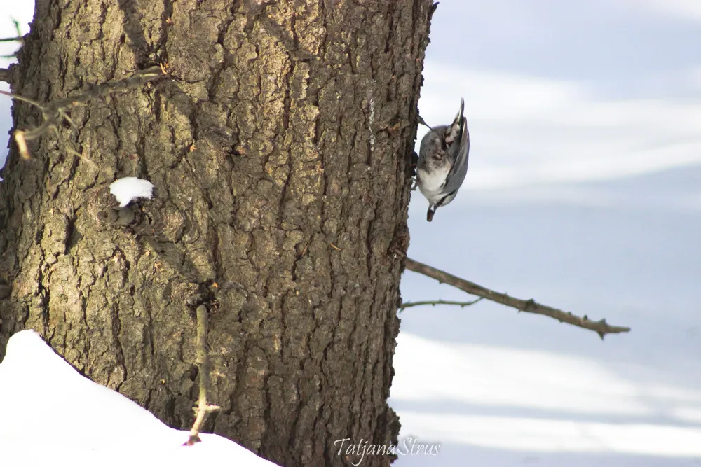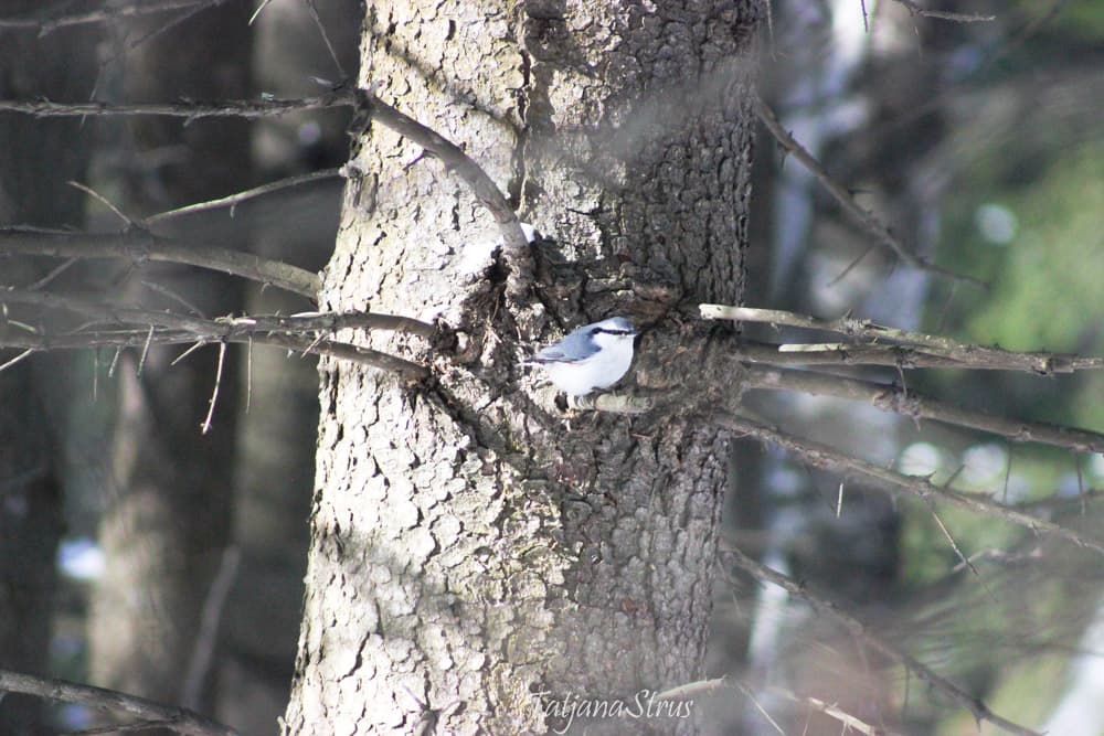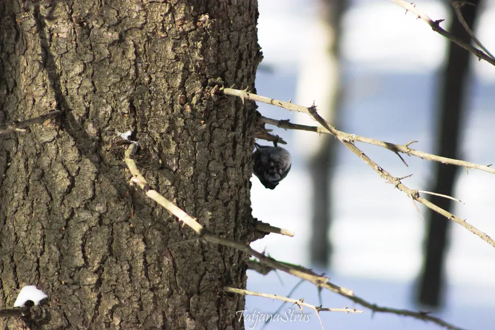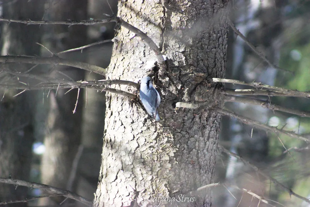 Продолжилось обследование коры ели, поползень дважды облетел вокруг дерева, оббежал снизу доверху.