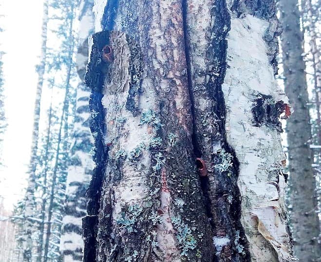 В расщелинах коры берёзы пушистой видна скорлупа расклёванных кедровых орехов.