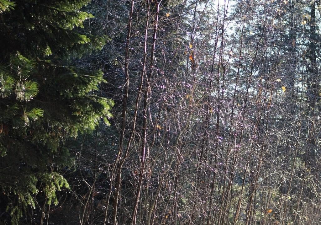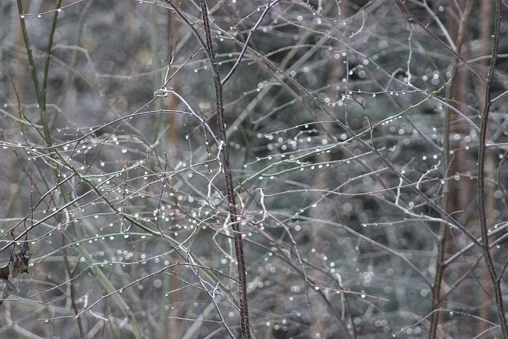 Ветер не успел осушить деревья после вчерашнего дождя и, после ударившегося ночного мороза, капли так и застыли на ветках.