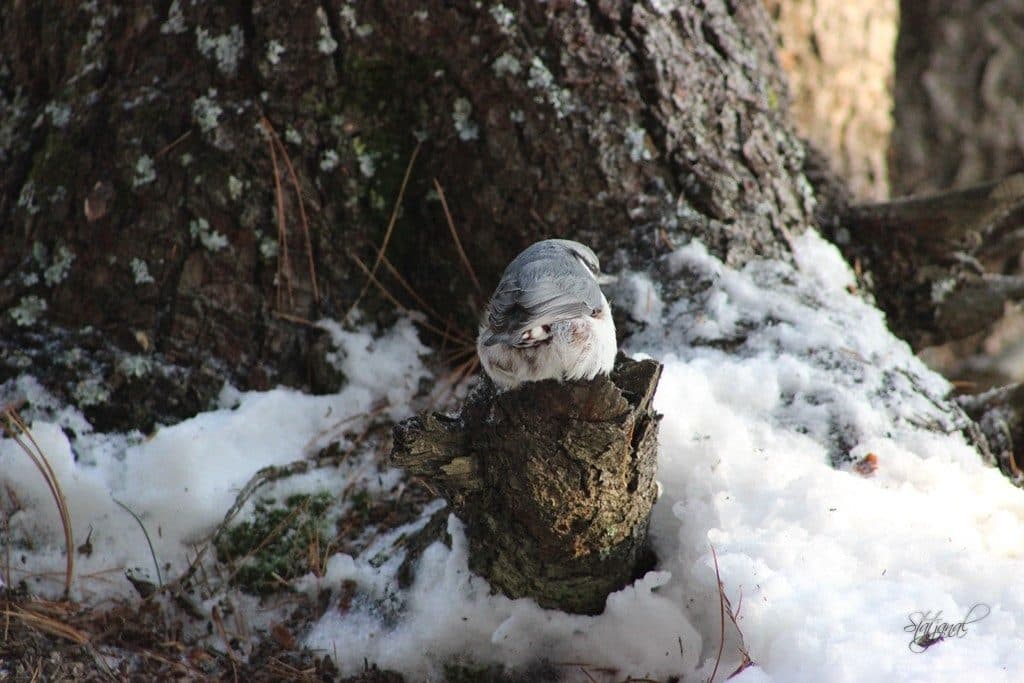 На земле суетится поползень, который в своих заботах о пропитании уже припрятал множество семян растений.
