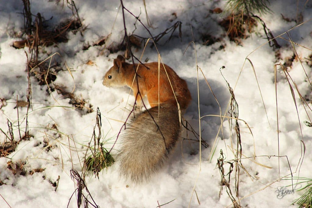 Некоторые белки, возможно, позднего помёта, остались до сих пор совершенно рыжими. На фоне рыжей травы они становятся совсем незаметными, но на фоне белого снега могут привлечь внимание хищников.