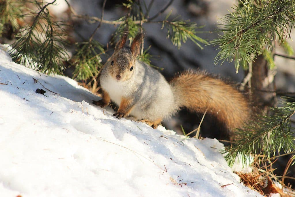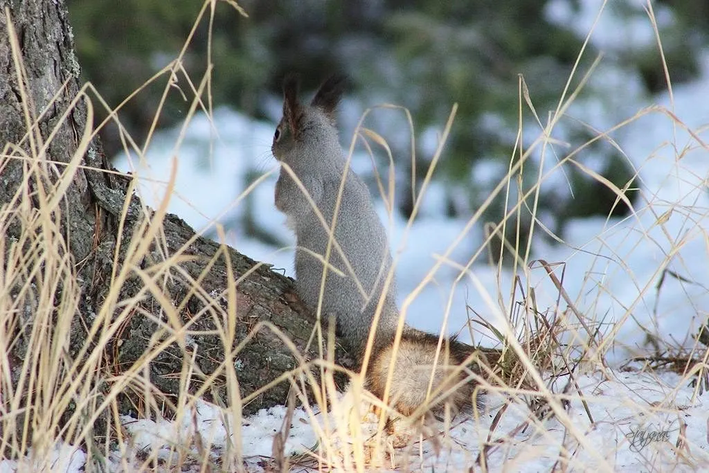 Многие белки перелиняли к зиме и имеют серый цвет шерсти, но пушистый хвост, лапы, уши с кисточками остались пока рыжими по причине тёплой и длинной осени.