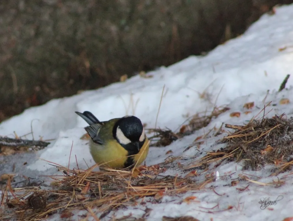 Среди деревьев, оставшихся без листьев стали заметны птицы, которые остались зимовать. Самая яркая, заметная из этих птиц — синица большая. Заметить её можно по ярко жёлтому брюшку,