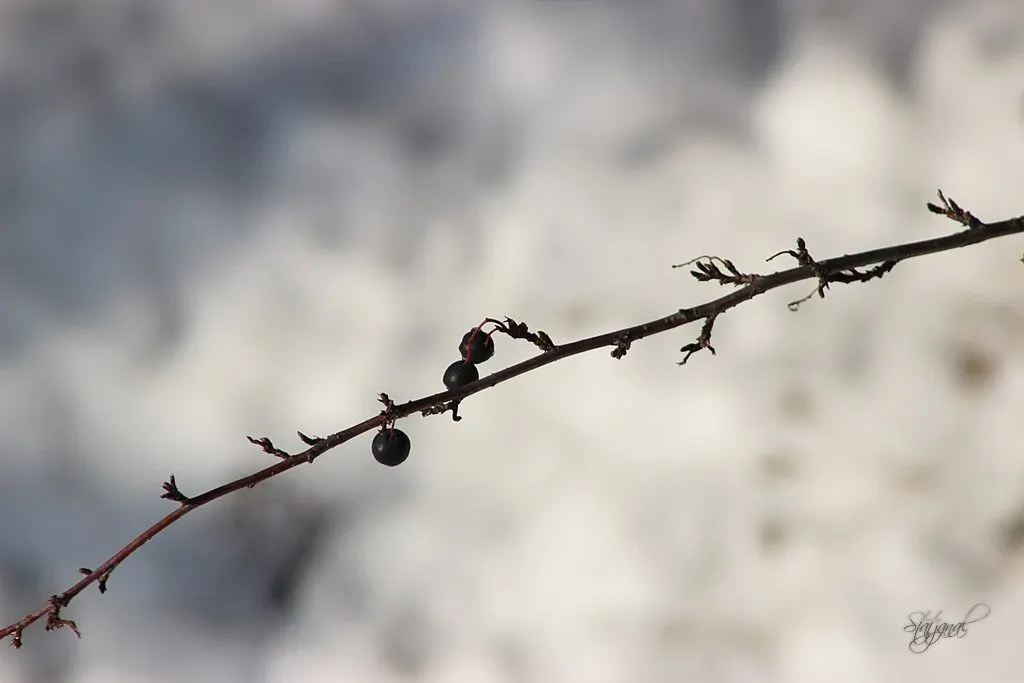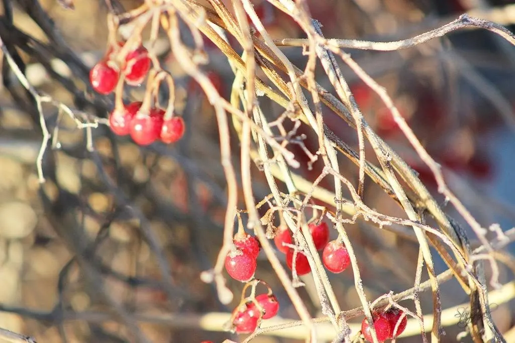 Оледеневшие ярко-красные ягоды паслёна Китагавы, так и остались висеть на одревесневающих, ветвистых побегах.