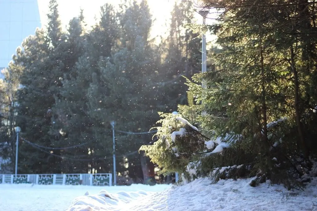 Небольшой ветерок сдувал снежную пыль с верхушек, ветвей деревьев и она, медленно кружась в воздухе, поблёскивая на солнечном свете оседала на землю.