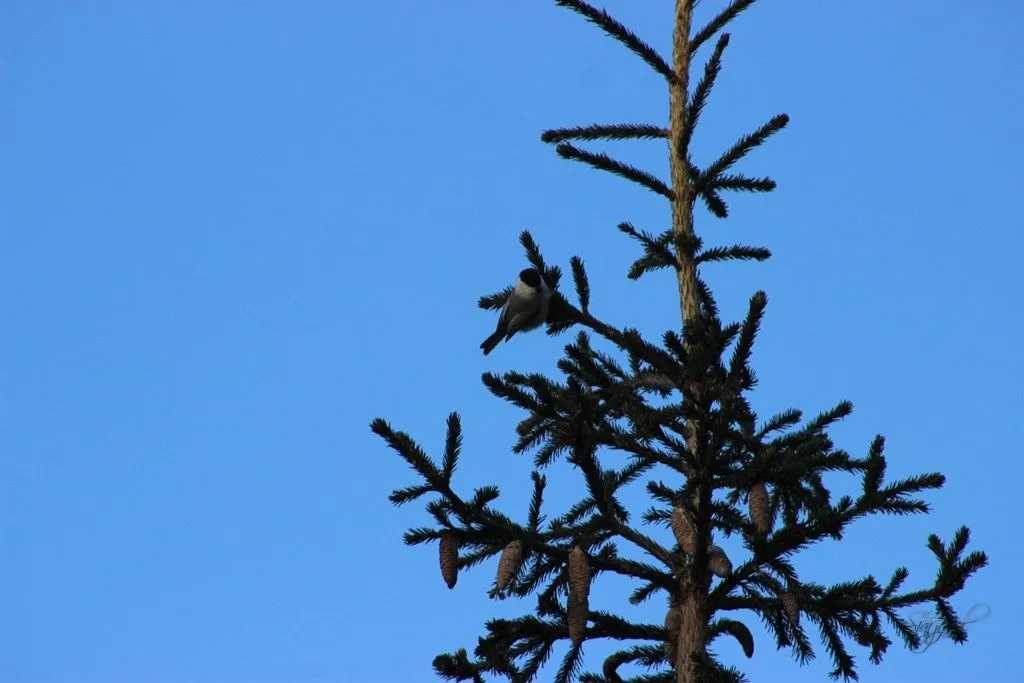 Вершину ели обыкновенной облюбовала стайка буроголовых гаичек, которые доставали семена из растущих на дереве шишек.