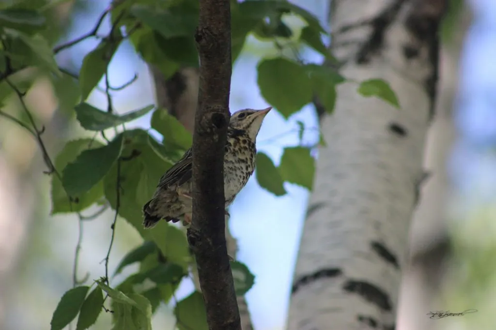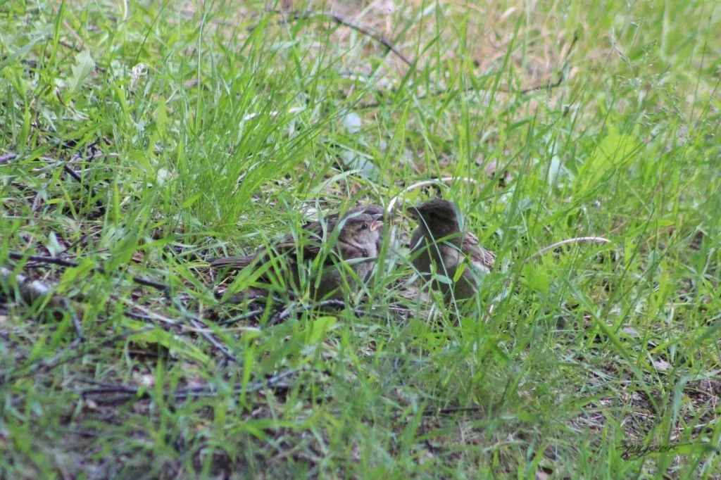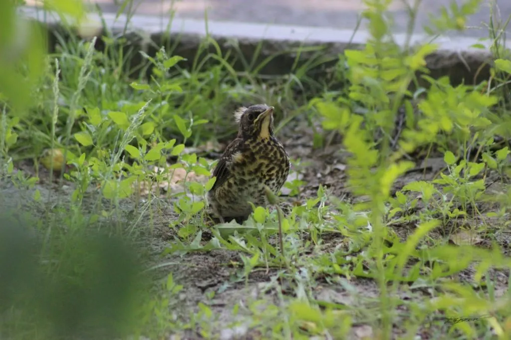 В этом году дрозды вывели потомство в этом парке и сейчас можно видеть горластый выводок. Вчера видели пару. Один слёток находится на краю парковки, второй в густой высокой траве. Но они не теряются, постоянно перекликаются. Молодые особи находятся в хорошем состоянии, здоровы. Это не «выпавший из гнезда птенчик, которому угрожает куча опасностей», а испытанный временем природный механизм, повышающий вероятность выживания. По моим, примерным подсчётам, в парке сейчас находится более десятка слетков дроздов-рябинников.