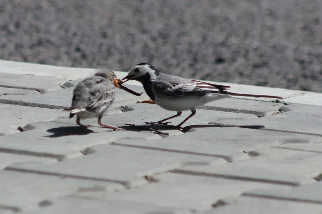 Голодный птенец белой трясогузки выбежал на парковку для машин и требует пищу.