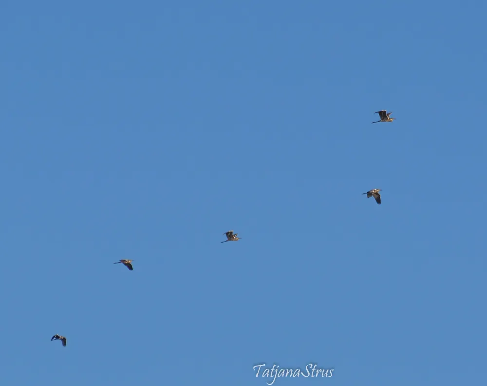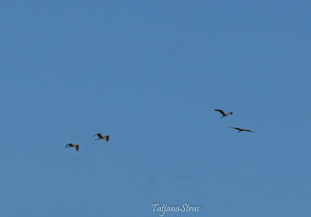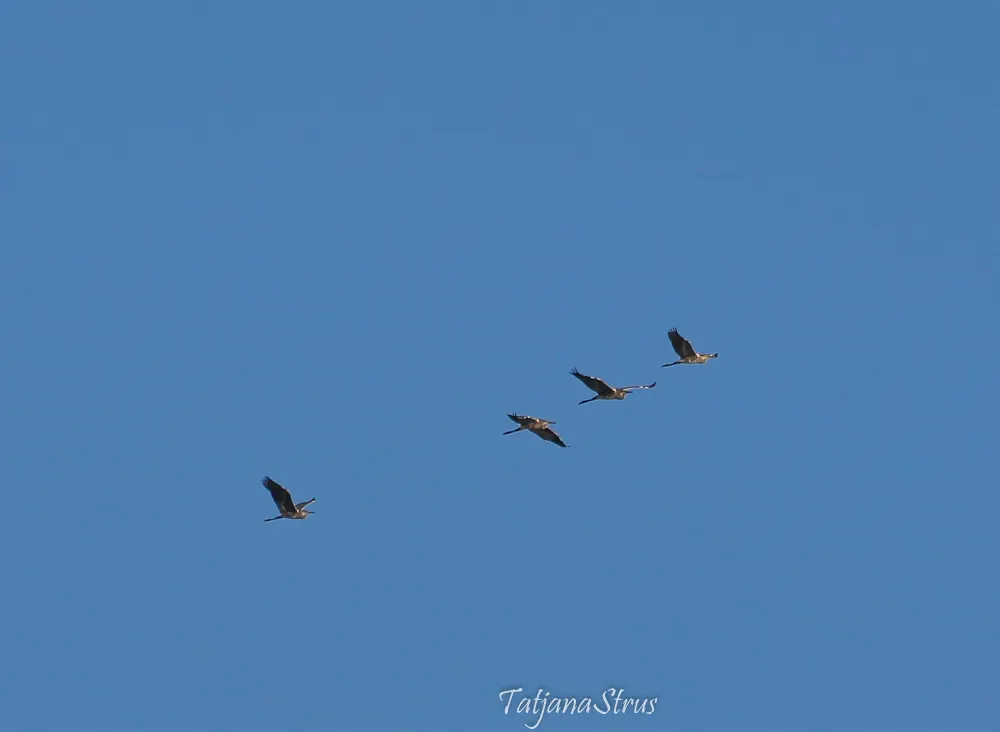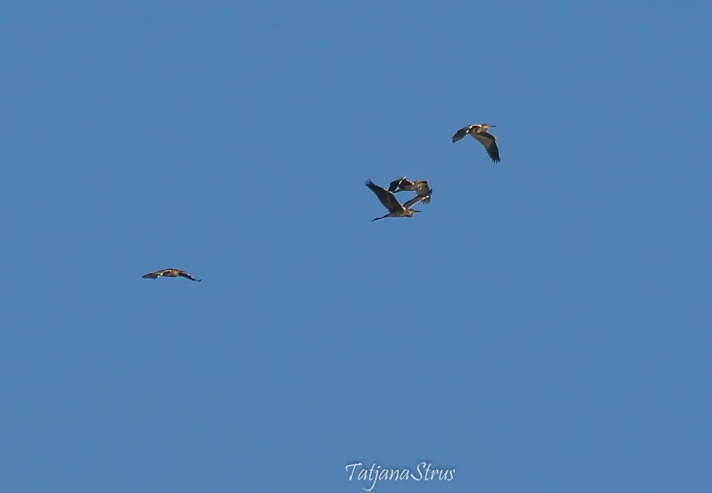 Вскоре стало возможно разглядеть, что летят довольно крупные птицы, шея сложена в виде латинской буквы S, длинный и острый клюв, ноги вытянуты далеко за хвост.