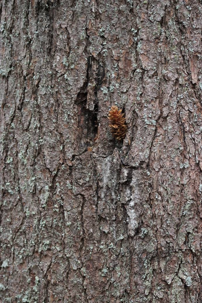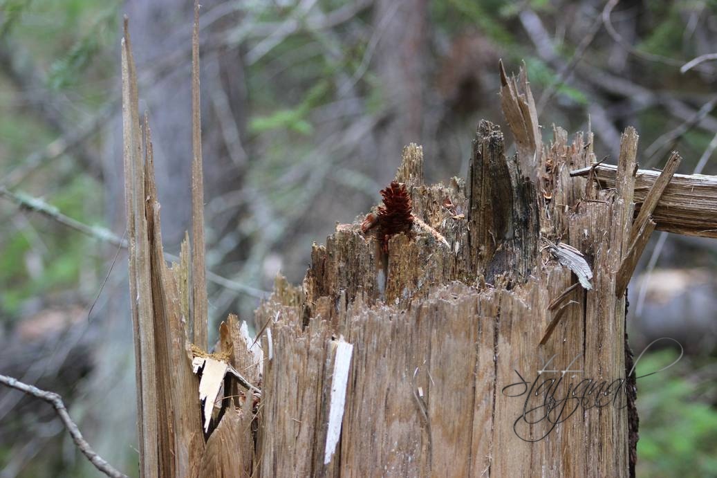 Иногда дятлы вместо деревьев для своей кузницы используют оставшийся от сваленного дерева пень. На вершине пенька видна раскрытая еловая шишка.