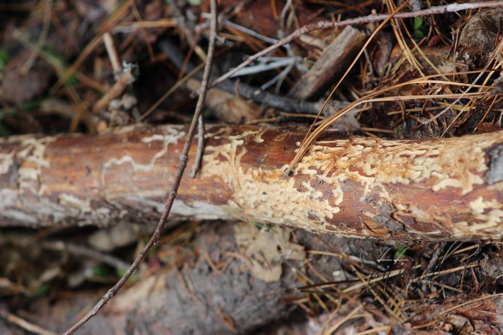На поваленных деревьях, на деревьях ослабленных пожарами, болезнями можно увидеть ходы оставленные жуками — лубоедами.