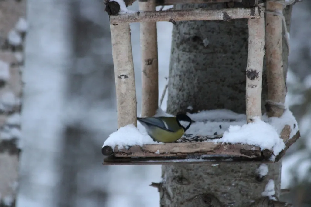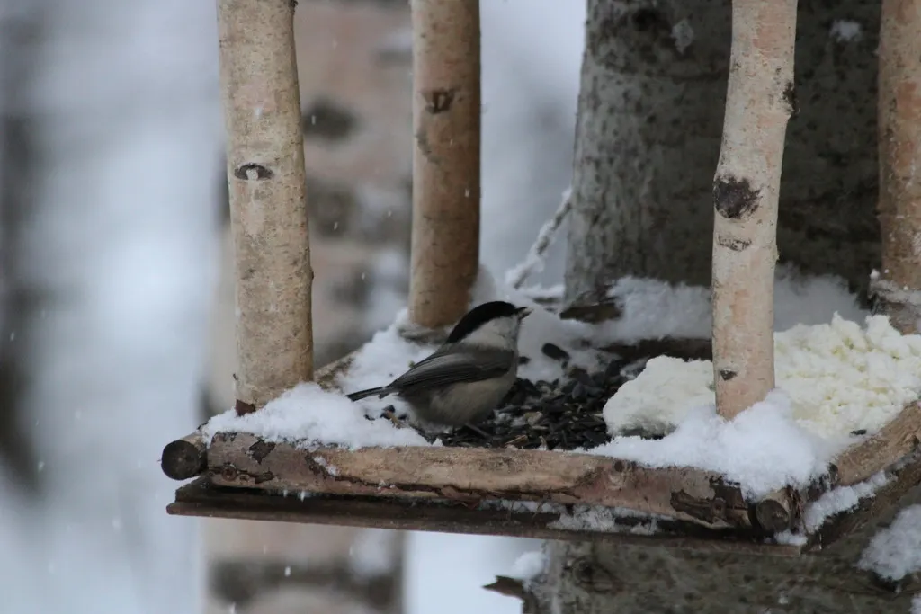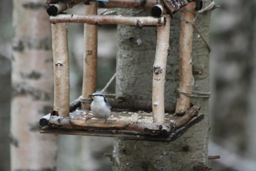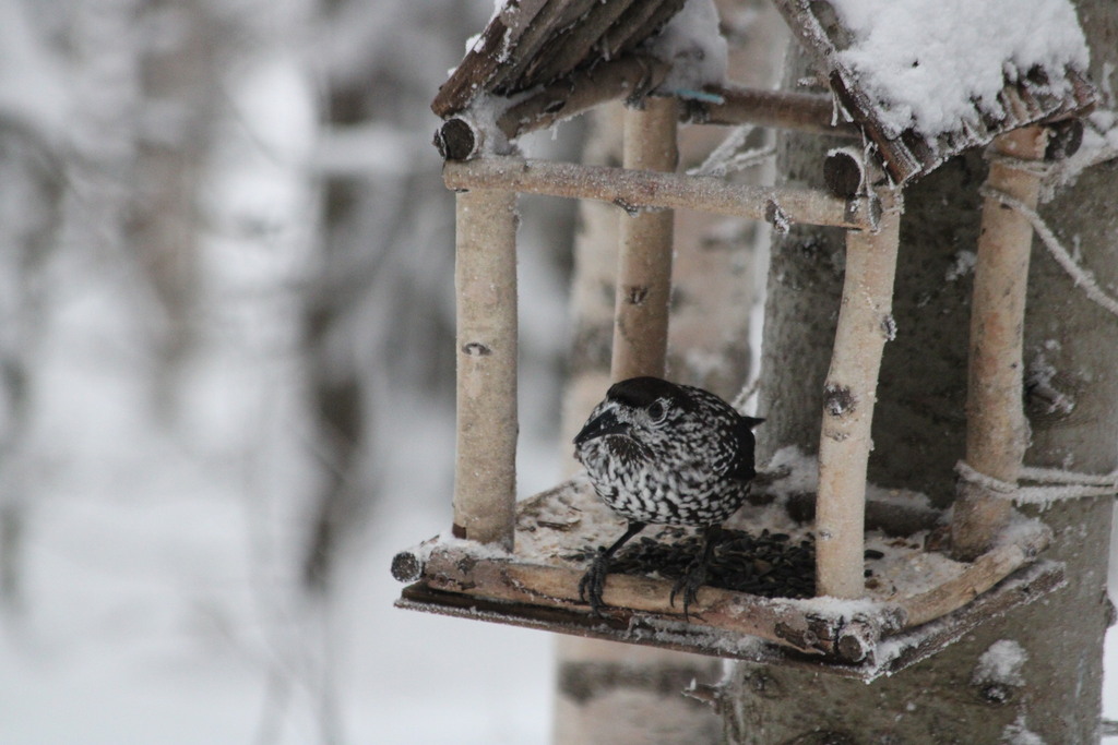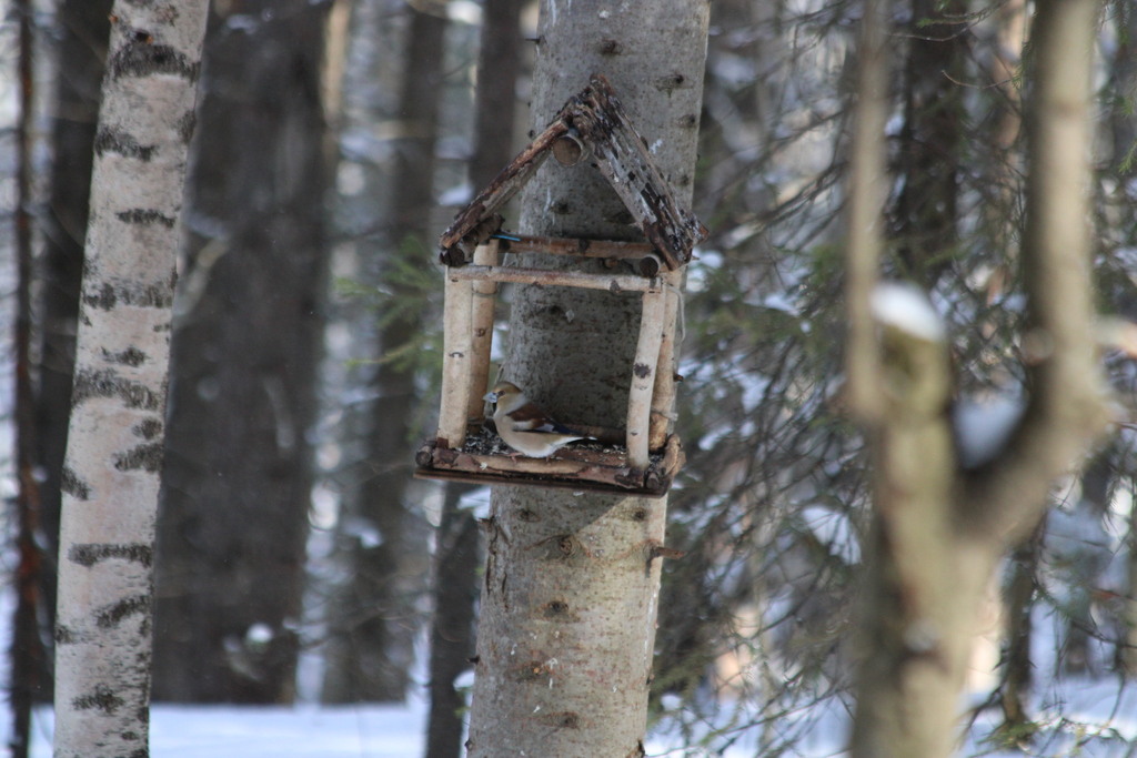 К кормушке прилетали подкормиться разные виды птиц: сойки, снегири, кедровки, поползни, синицы, пухляки, дятлы, дубоносы, чечётки и другие.