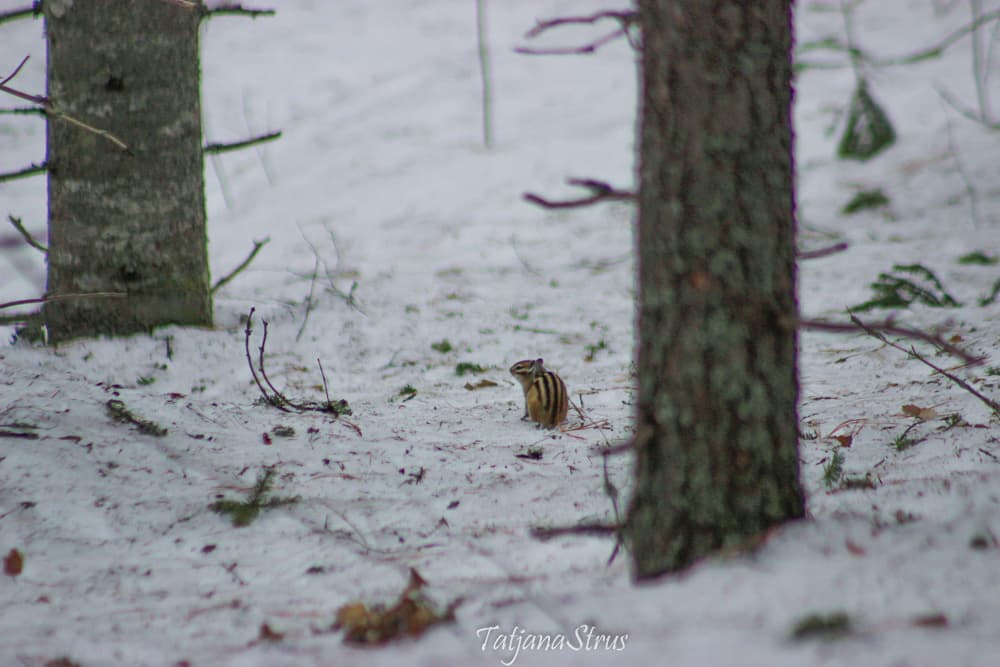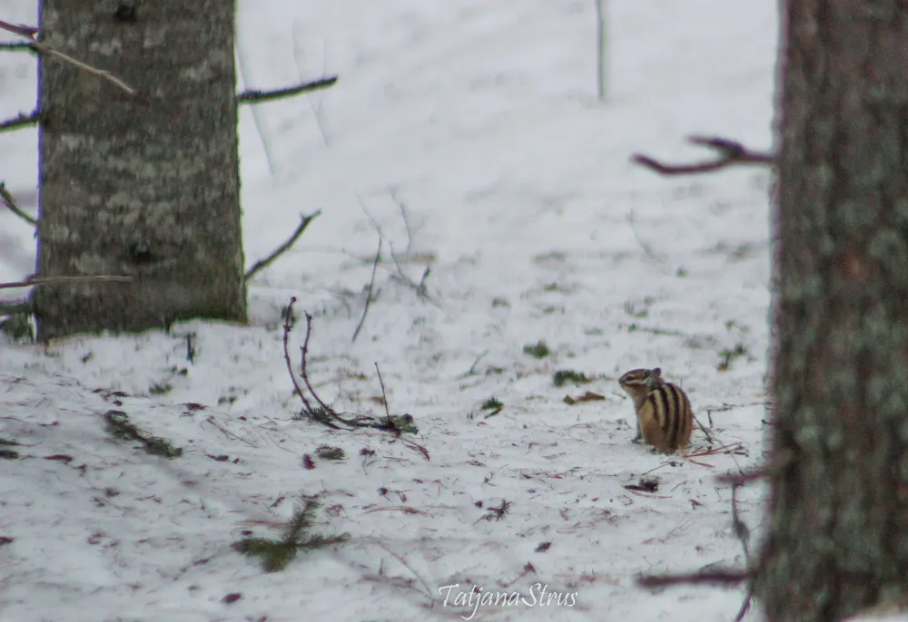 В начале апреля сибирские бурундуки окончательно просыпаются и выходят на поверхность из своих норок. Одного такого бурундука после долгой зимней спячки удалось снять на камеру. Бурундук прибежал подкрепиться к месту, где ведётся подкормка лесных птиц подсолнечными семенами и другим кормом. Но, услышав голоса людей, решил переждать за соседними деревьями, откуда и наблюдал за нами. Долго голодным бурундука мы не могли оставлять, поэтому подсыпав корм в кормушку и на снег, под дерево отошли на некоторое расстояние, откуда и наблюдали за зверьком.