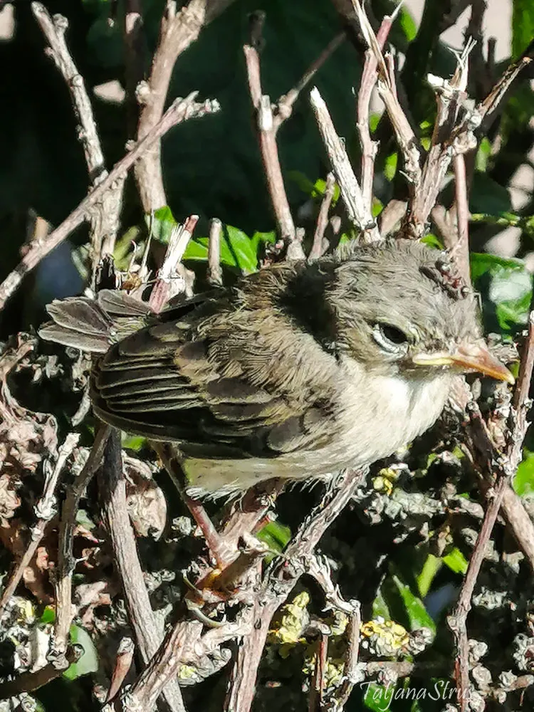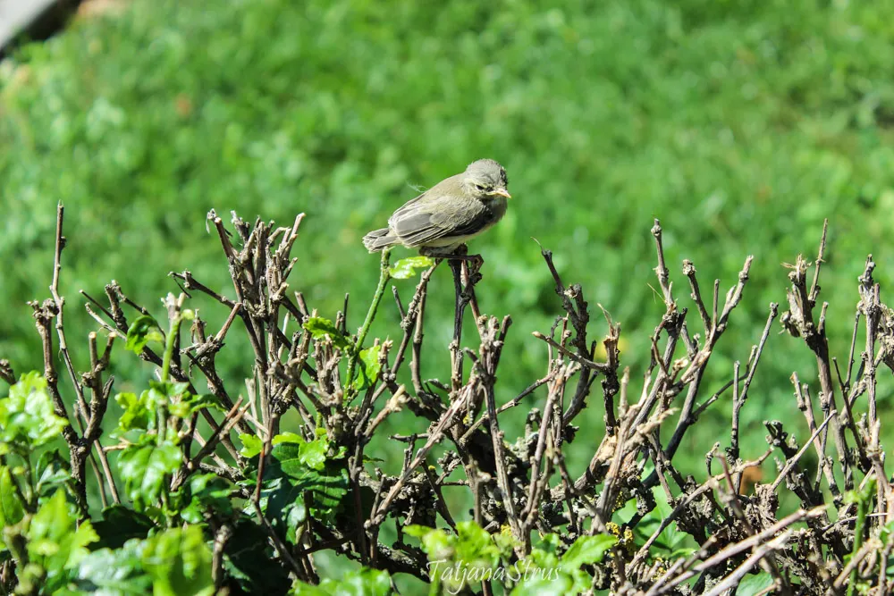 На вершине кустарника, не замечаемые проходящими жителями города, сидели птенцы пеночки, которые были совсем крошечными и не вспархивали при приближении.