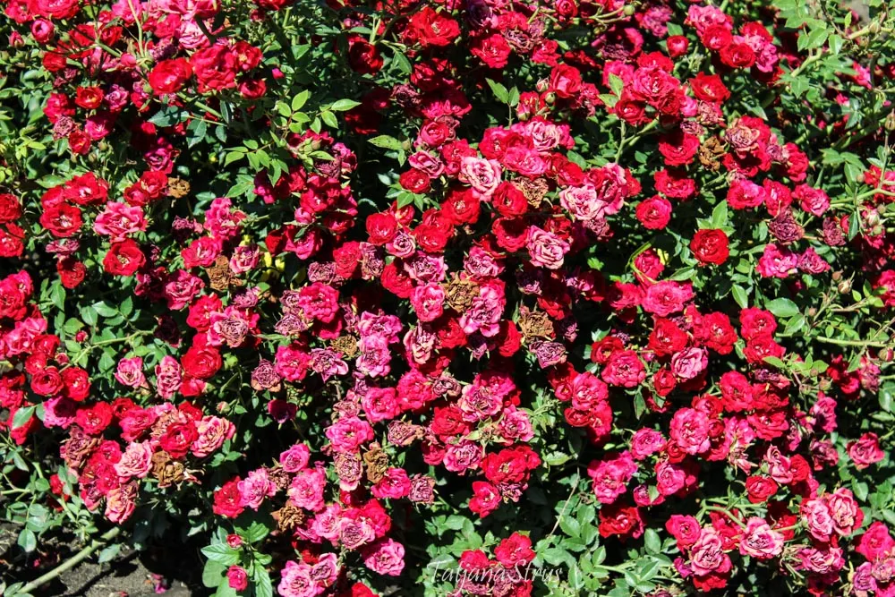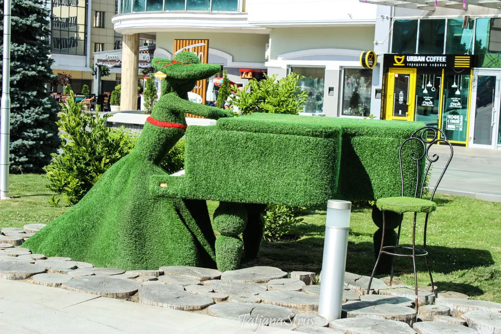На центральной площади — цветущие липы и розы, каштаны, голубые ели, можжевеловые, фигуры из искусственного газона.