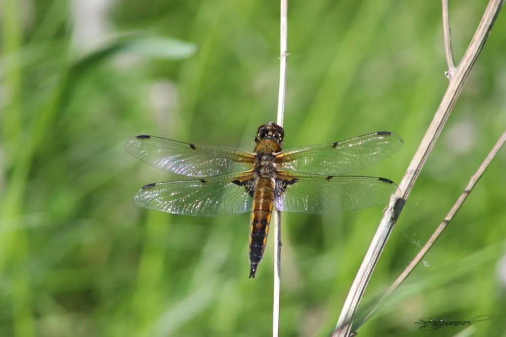 Плоскобрюх четырёхпятнистый, или четырёхпятнистая стрекоза (Libellula quadrimaculata) — стрекозы средней величины: длина брюшка составляет 27-32 мм, крыльев — 32-39 мм. Отличительный признак, давший название виду, — тёмные пятна в районе узелка каждого из четырёх крыльев. Встречена 25.05.2020. Вид многочисленный и распространенный.