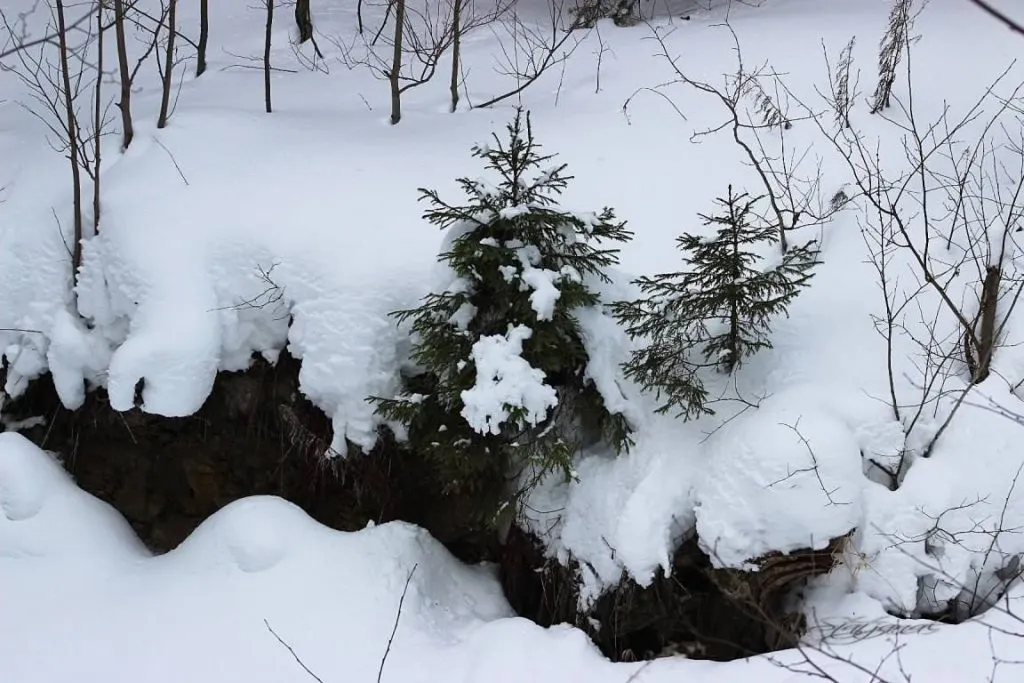 Сырой снег в лесу осел и стал виден обрывистый берег ручья с растущими на краю небольшими елями.