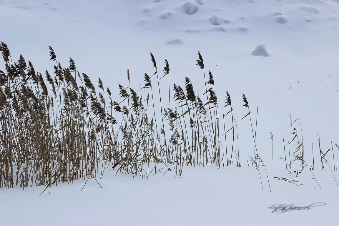 На рыхлом снегу видно множество следов мелких птиц, которые отыскивают на поверхности семена растений.