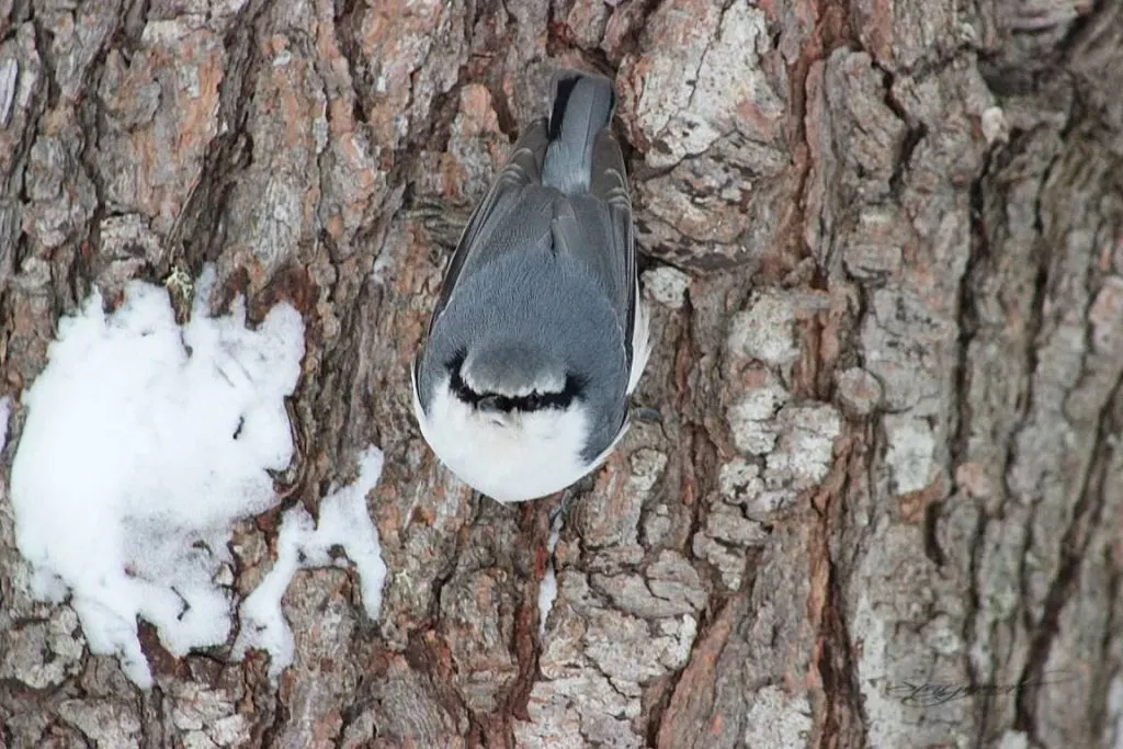 Поползень представляет другое семейство, отличное от вышеперечисленных синиц, поползни. Поползни отличаются друг от друга окраской боков их тела, размерами. Зимой их часто видишь в стайках синиц. Поползней можно видеть резво бегающих по дереву, выискивающих прячущихся в коре дерева насекомых и их личинок.