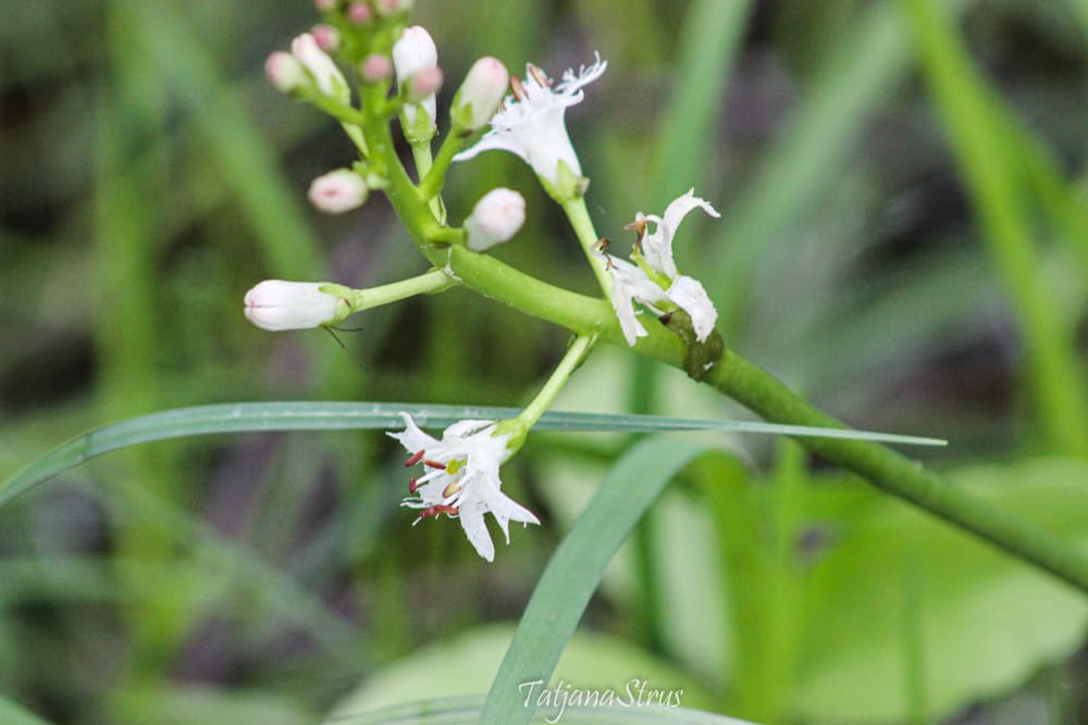 Во время цветения это травянистое растение ни с чем не спутать: только у вахты внутренняя сторона лепестков густо опушена длинными изогнутыми волосками. Цветки эти розовато-белые, с ярко-оранжевыми пыльниками, собраны в прямостоящую кисть высотой 10-15 см. Они распускаются по очереди, будто заступают на вахту, отсюда и пошло название рода. Цветение непродолжительно, всего около двух недель.