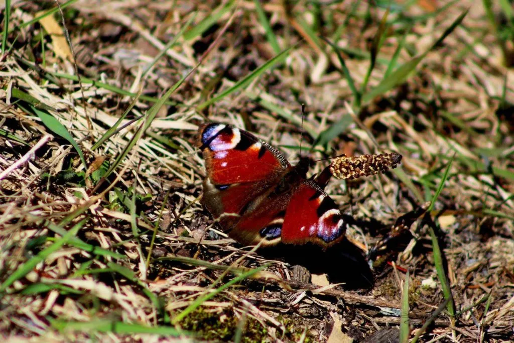 Бабочка девной павлиний глаз встречена на обочине асфальтированной дорожки лыжной трассы. Павлиний глаз — одна из самых ярких бабочек, получившая свое название за характерные пятна-глазки на крыльях. Павлиний глаз — бабочка довольно обычная в тех местах, где люди не вмешиваются в естественные биосистемы. Взрослые бабочки больше всего любят пить нектар чертополоха, лопуха могут посещать различные садовые цветы, часто садятся на влажную землю, кору с вытекающим соком растений. В северных регионах павлиний глаз успевает дать за лето одно поколение. Продолжительность жизни каждой особи несколько месяцев.