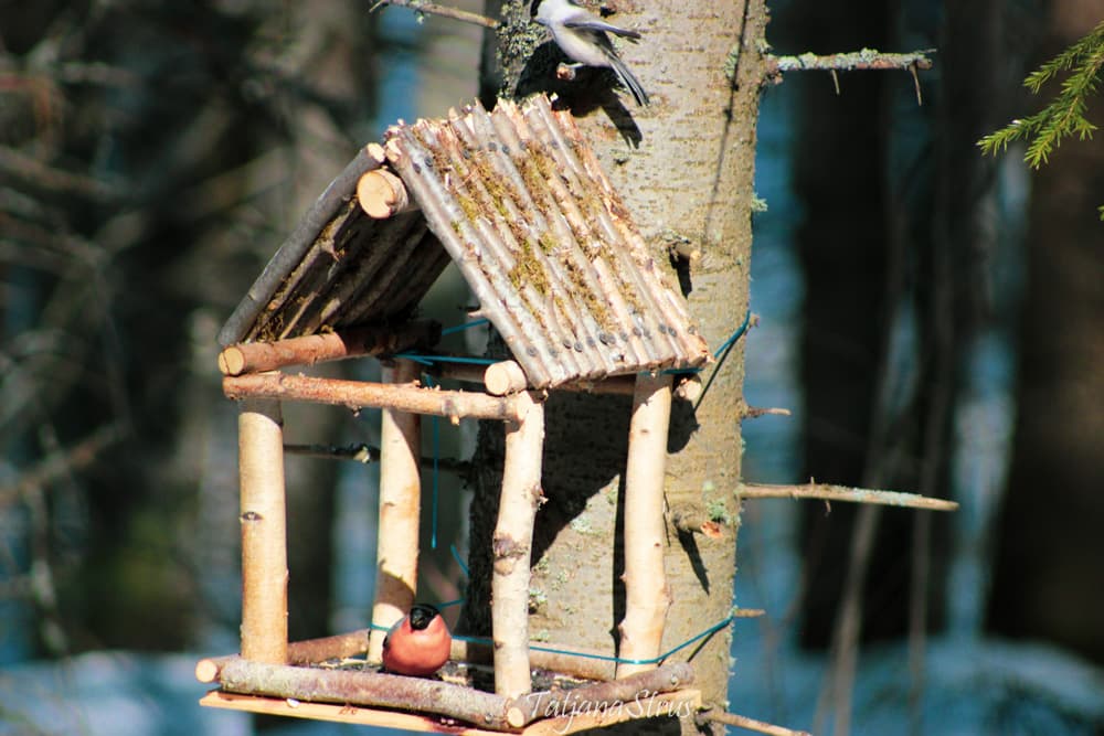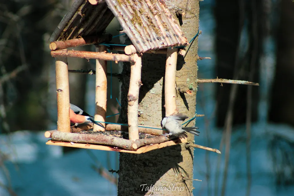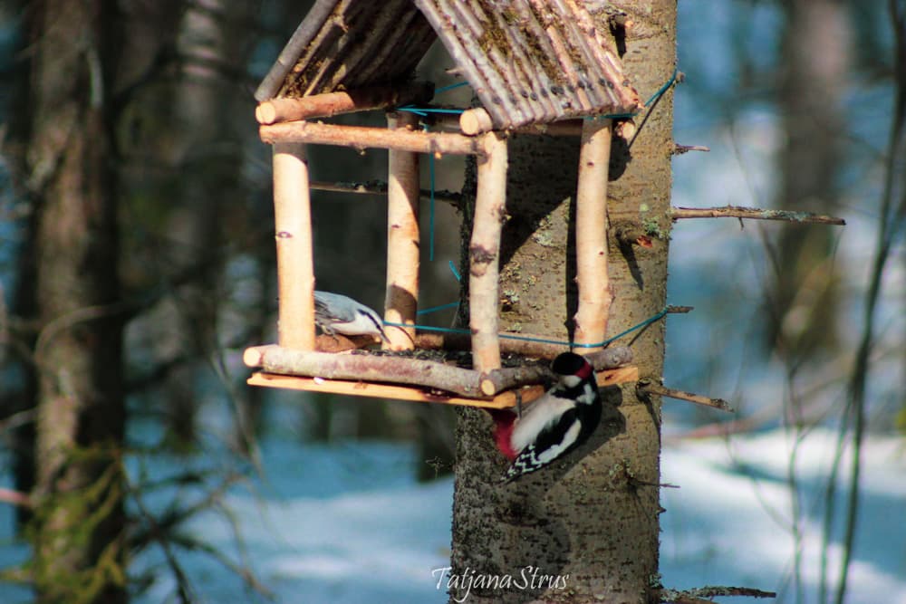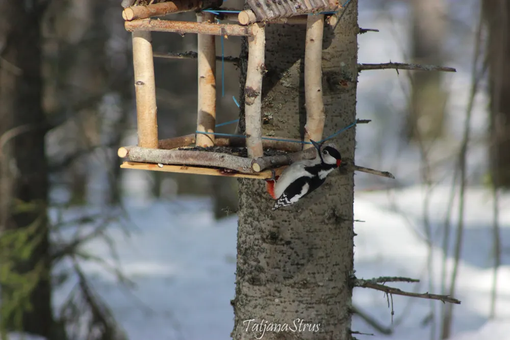Возле одной из такой кормушки вначале меня встретила тишина. Но стоило только насыпать корма — подсолнечных семечек, как тут же прилетел большой пестрый дятел и принялся за семена.