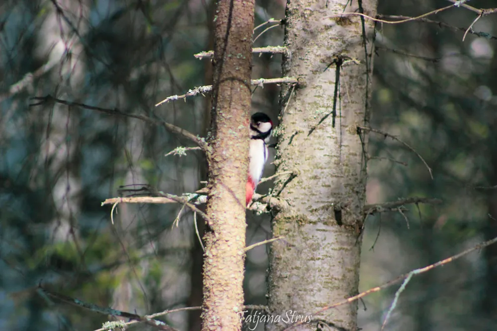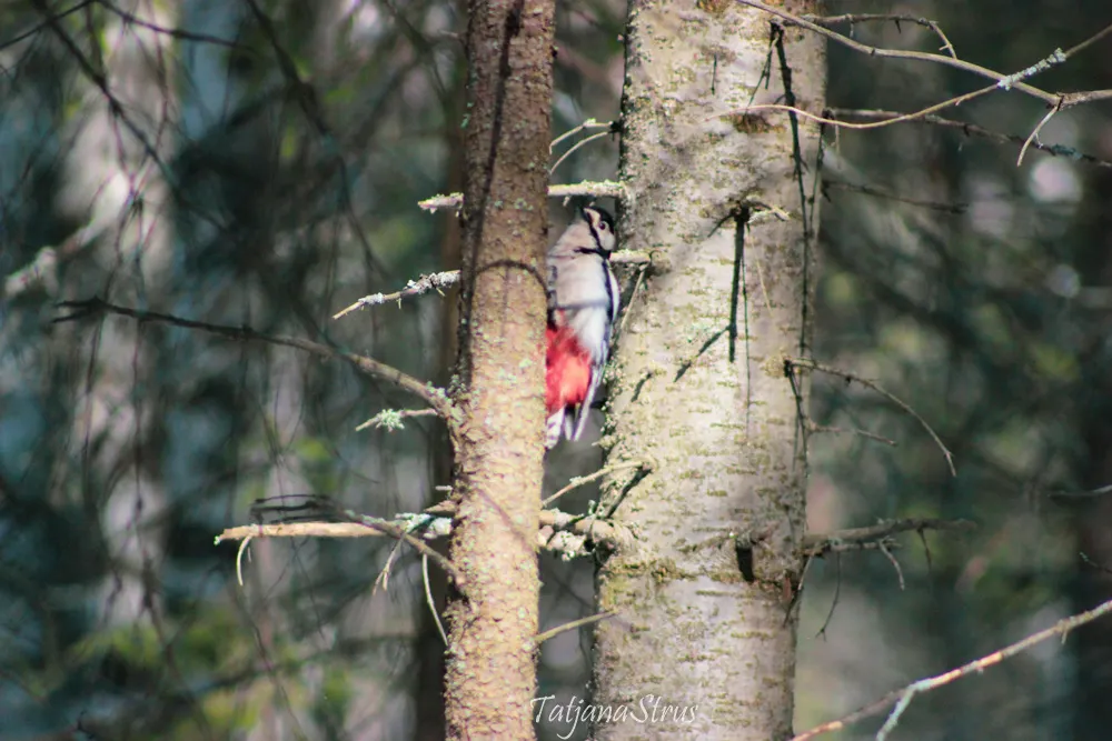 Усевшись на соседнее дерево и принявшись за поиск укрывшихся в коре дерева животных, дятел изредка посматривал на меня.