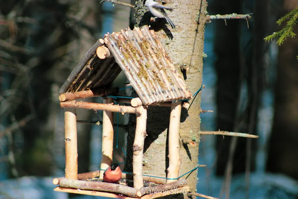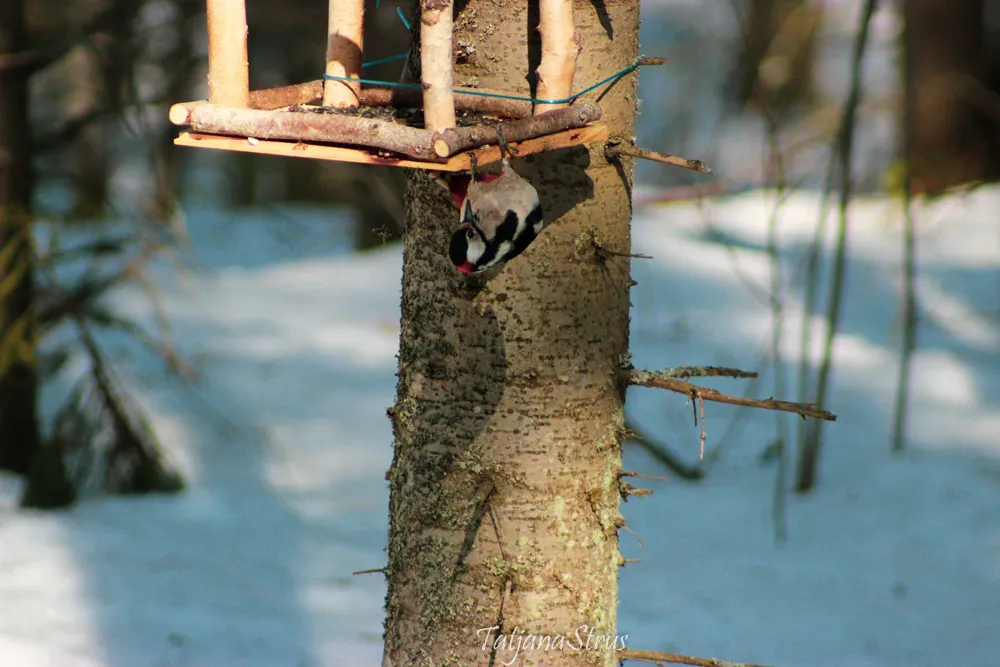 Не дождавшись конца обеда дятла, сделала несколько шагов к кормушке, чем насторожила и спугнула его.