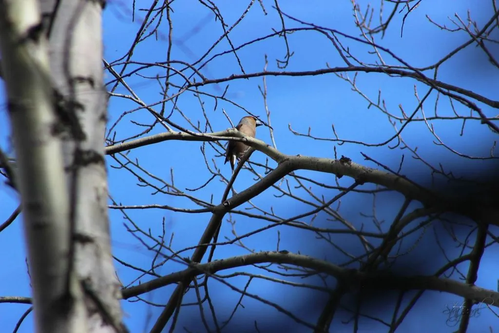 В кронах деревьев можно увидеть прилетевшего дубоноса обыкновенного.