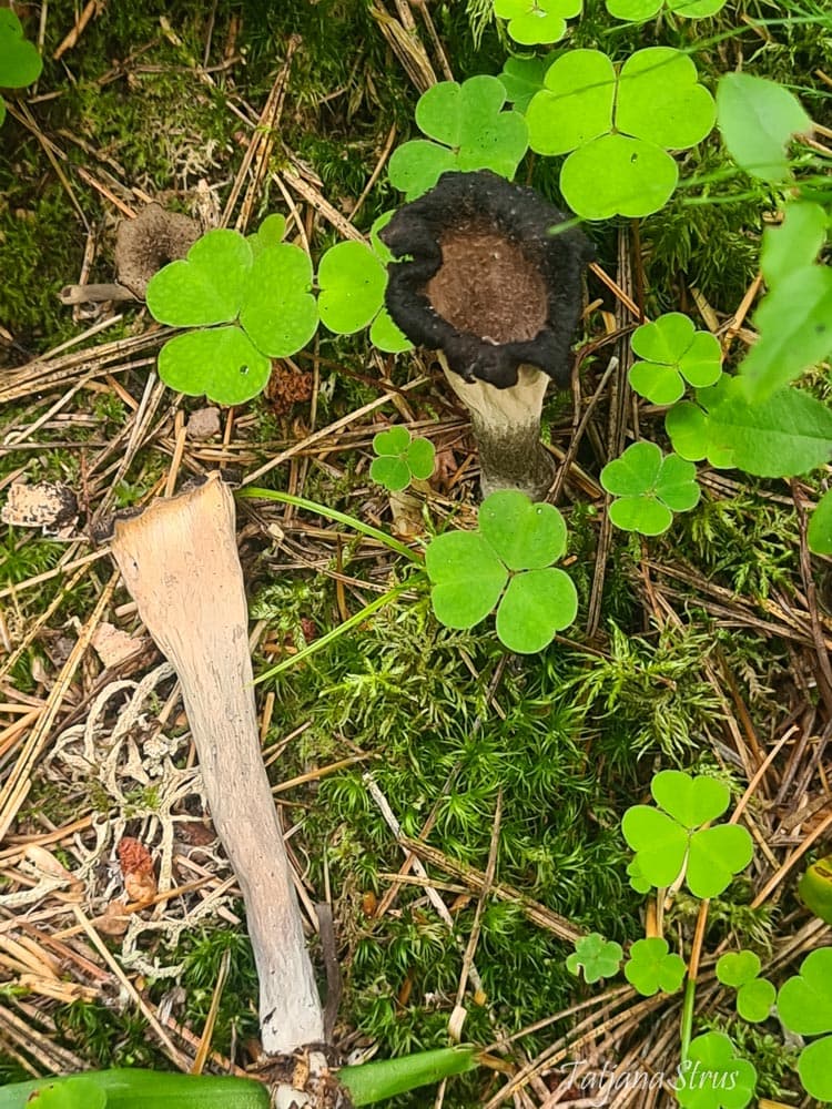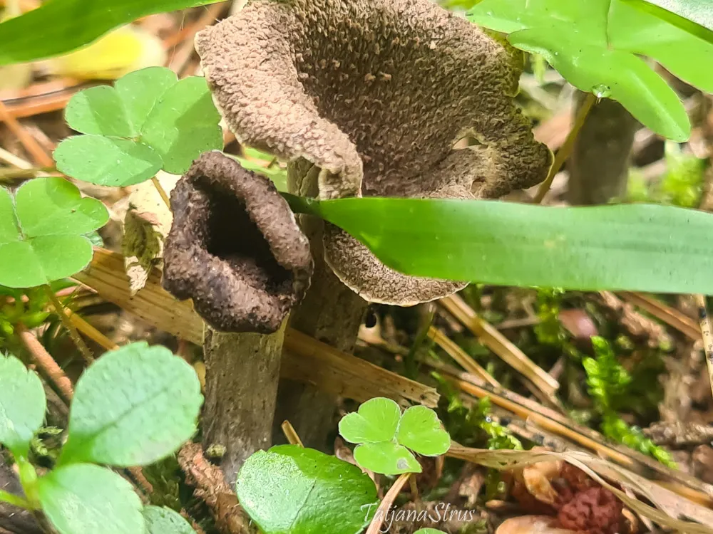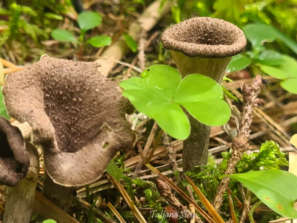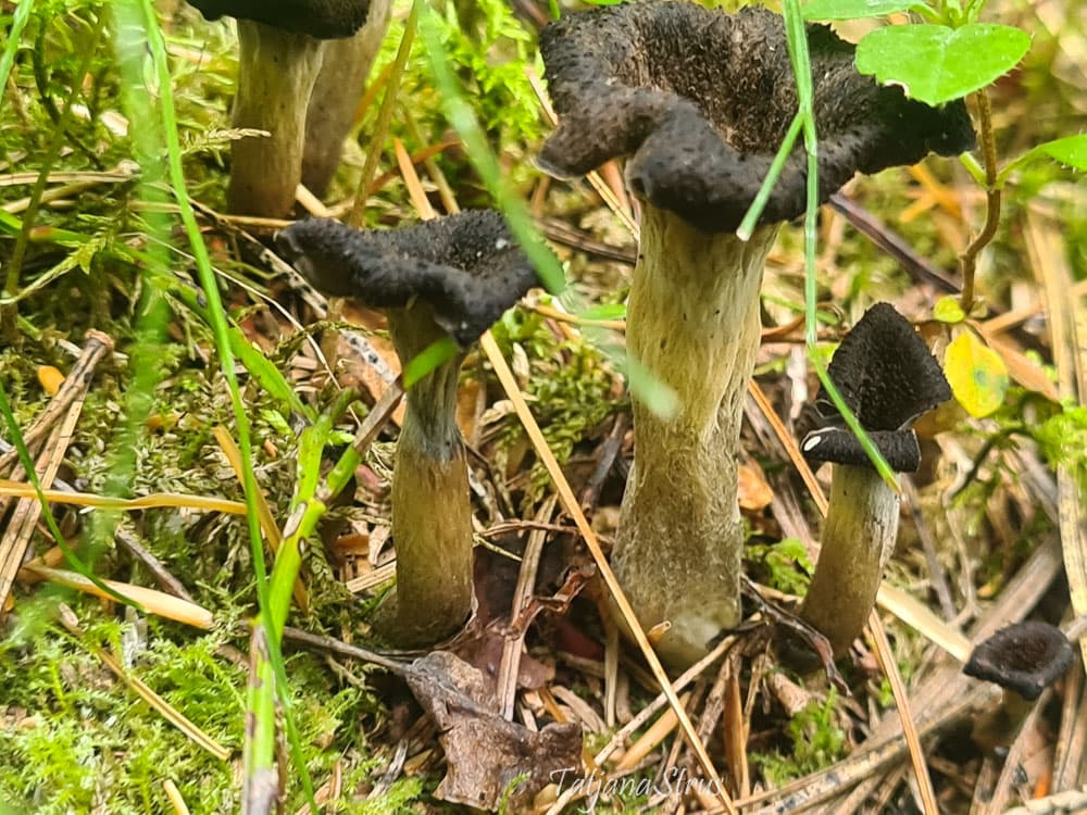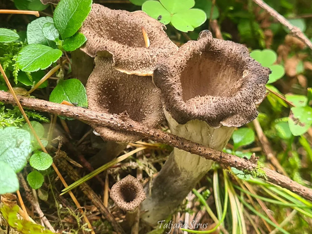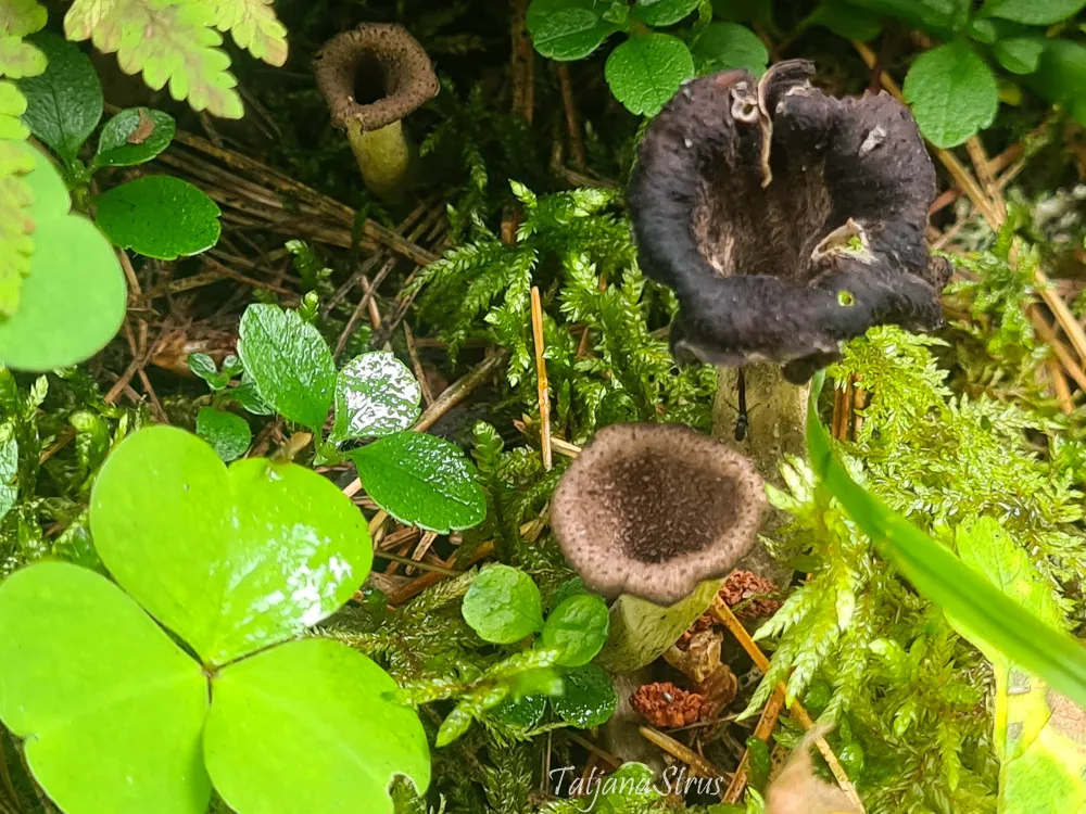 Craterellus cornucopioides имеет миниатюрный размер и мрачный цвет, которые позволяют ему удивительно хорошо сливаться с окружающей средой.