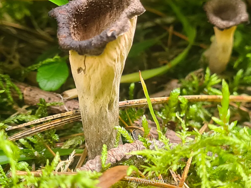 Старые экземпляры Craterellus cornucopioides темнеют, особенно темной становится шляпка. Ножка гриба остается светлой, покрытой налётом.