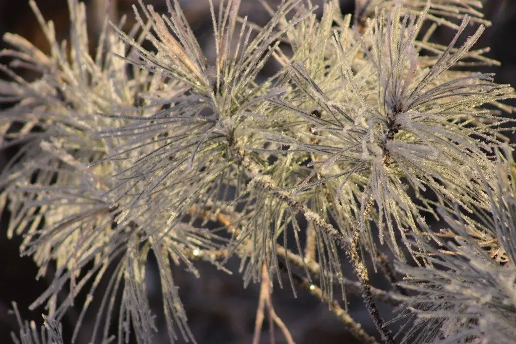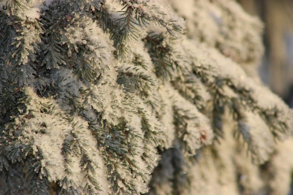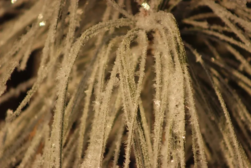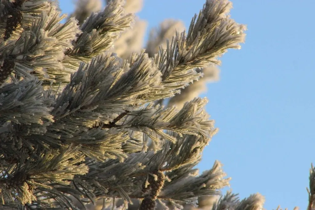 Небольшой слой изморози на ветках сосны обыкновенной не приводит к её ломкости.