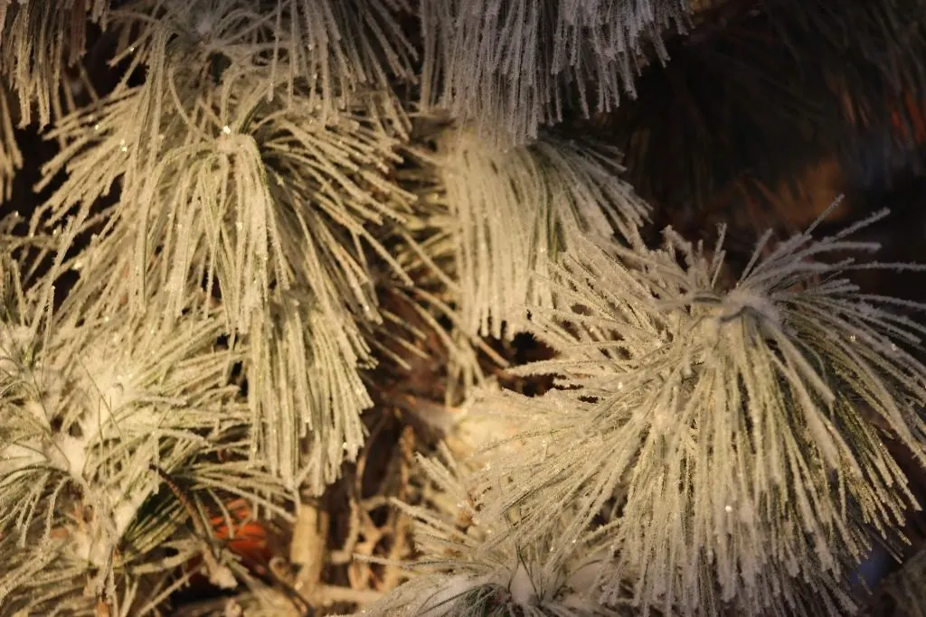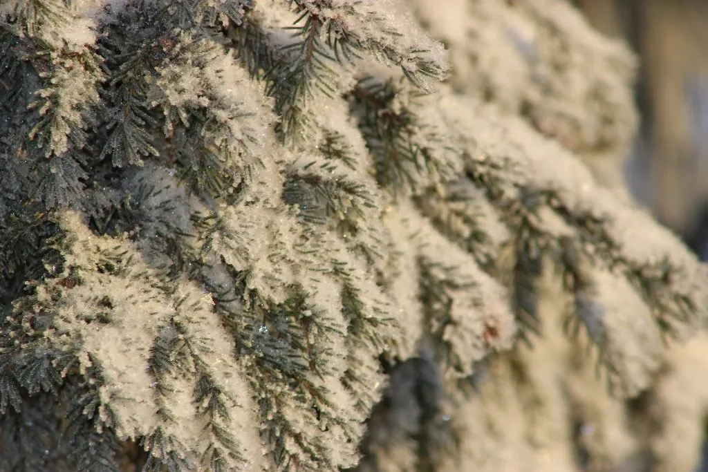 Хвоя похожа наискусственную, на солнце сверкают кристаллы льда.
