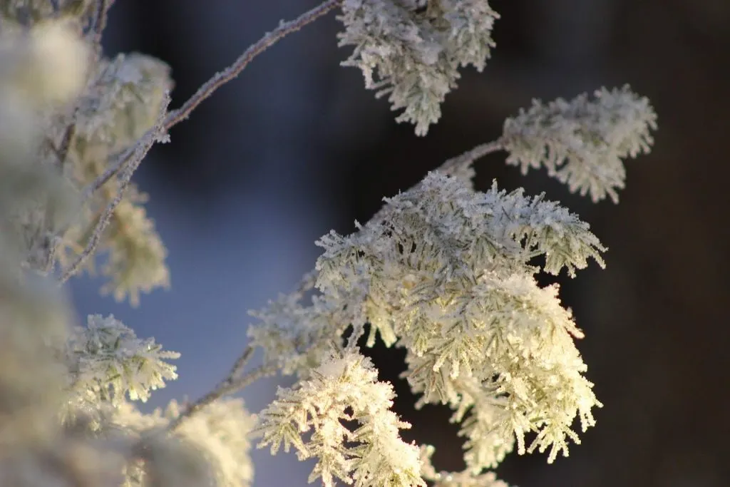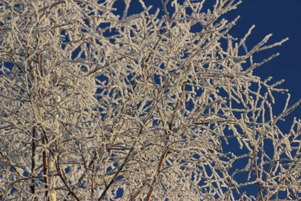 Все растения в лесу покрыты нежной и ажурной изморозью. Ее ещё называют «сибирской» или «полярной». Для образования такой изморози кроме минусовой температуры необходим туман или густая дымка (водяной пар в воздухе). При очень сильных морозах (ниже -30оС) кристаллическая изморозь может возникать и без тумана, но тоже за счет водяного пара, содержащегося в воздухе.
