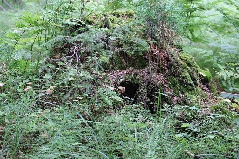 Обросший лесной растительностью пень похож на сказочный. От земли до верхушки зарос мхами, лишайниками. Кедровые семена здесь нашли все необходимые условия для всхода, проросли и стали частью внешнего убранства пня. Линнея северная, любительница таких высоких мшистых мест, обвила его ползучими тонкими побегами. На нижнем ярусе пня растёт кислица обыкновенная. На верхушке поселилась грибница. Вокруг пня, как стражники выросли высокие стебли папоротника. Дополняет сказочную картину домика небольшое круглое отверстие — вход во внутреннюю часть пня. В таких норах могут выводить потомство, прятаться от внешних опасностей животные, укрываться от погодных условий. Красавец пень — удивительное создание природы.