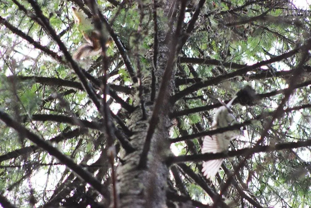 Борьба за пространство между птицами и белками. Временами слышны крики птиц и видны движения белок по веткам дерева.