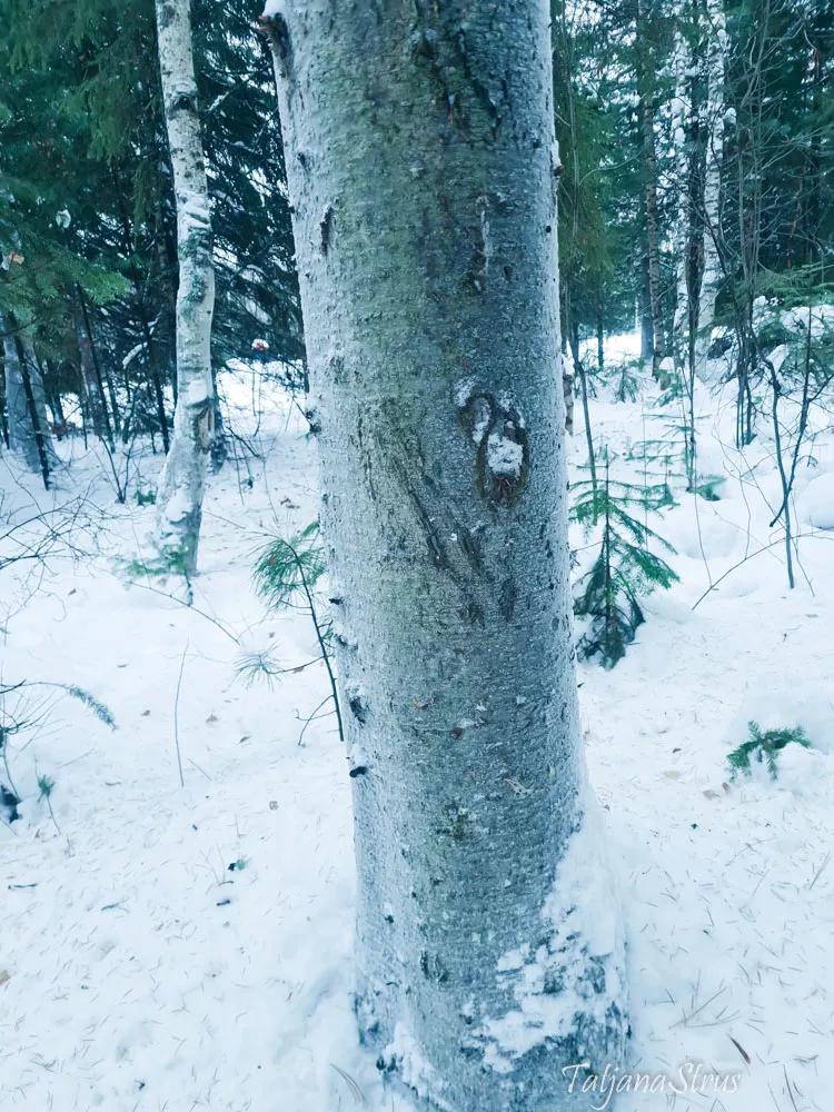 Ствол дерева, при плюсовой температуре, начал оттаивать и поверхность покрылась изморозью.
