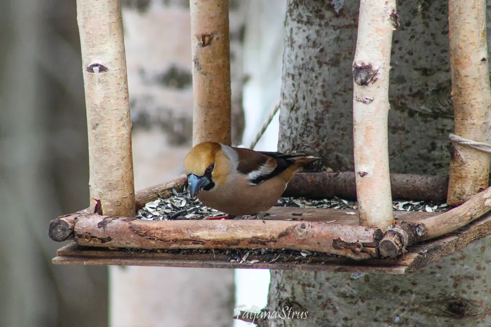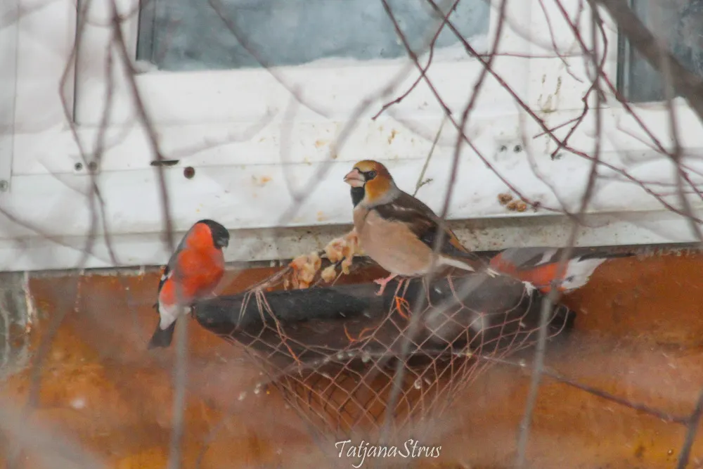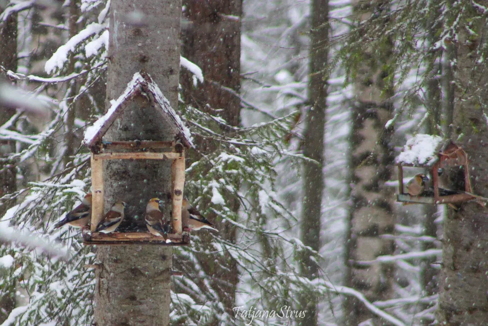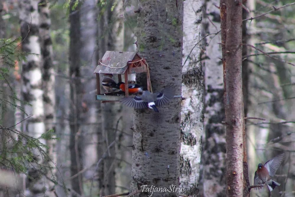 Стайку дубоносов в зимнее время так же можно увидеть и на лесных кормушках, которые мы ежедневно наполняем подсолнечными семенами. Так же можно подкормить дубоносов косточками черёмухи и вишни, менее охотно поедают рябину и бузину, а также семена граба, клёна, чертополоха, подсолнуха, буковые орешки.
