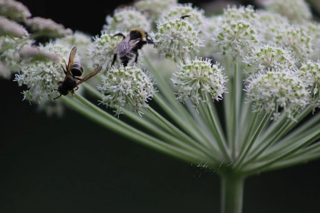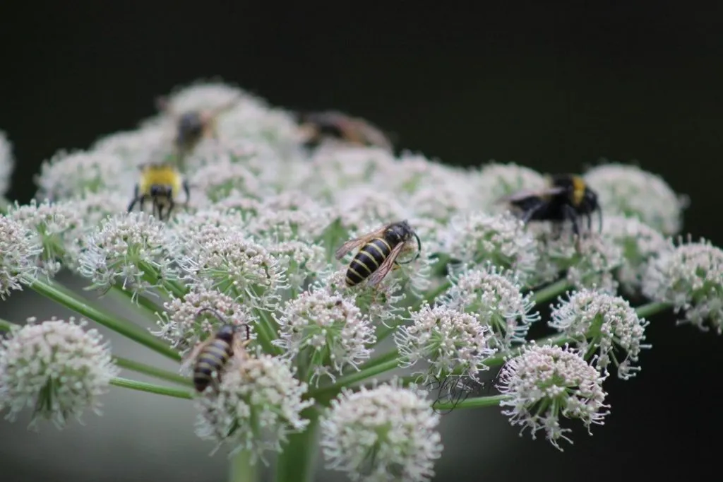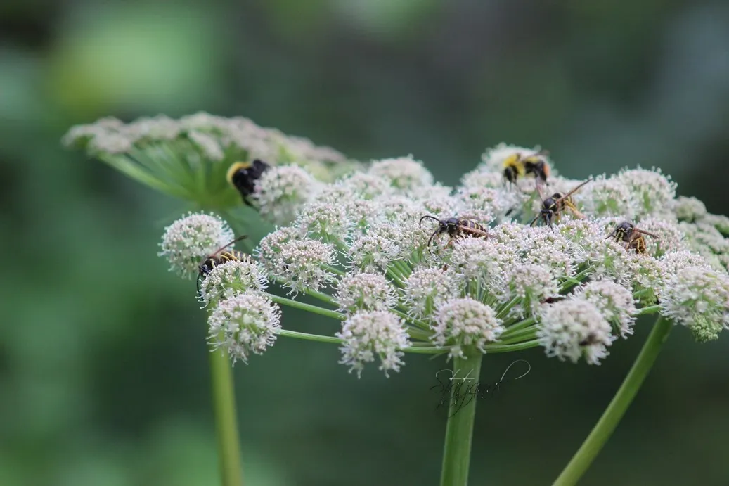 Эти зонтики привлекают ос, мух, шмелей, которые подолгу фуражируют на таких соцветиях, кропотливо собирая нектар и пыльцу. Пыльца — превосходная пища для организма, она содержит 7—30% белка со всеми необходимыми аминокислотами, все нужные витамины и холестерин (Herbert et al., 1980), а также вкусовую добавку — ненасыщенный С18-алкан (Johansson, Johansson, 1977).