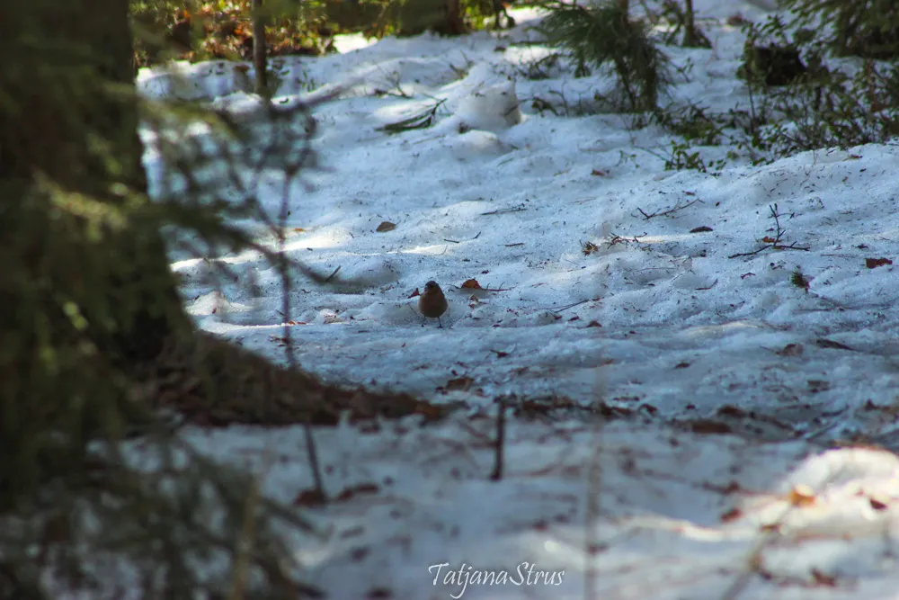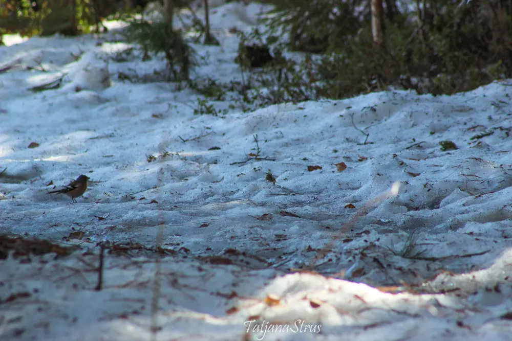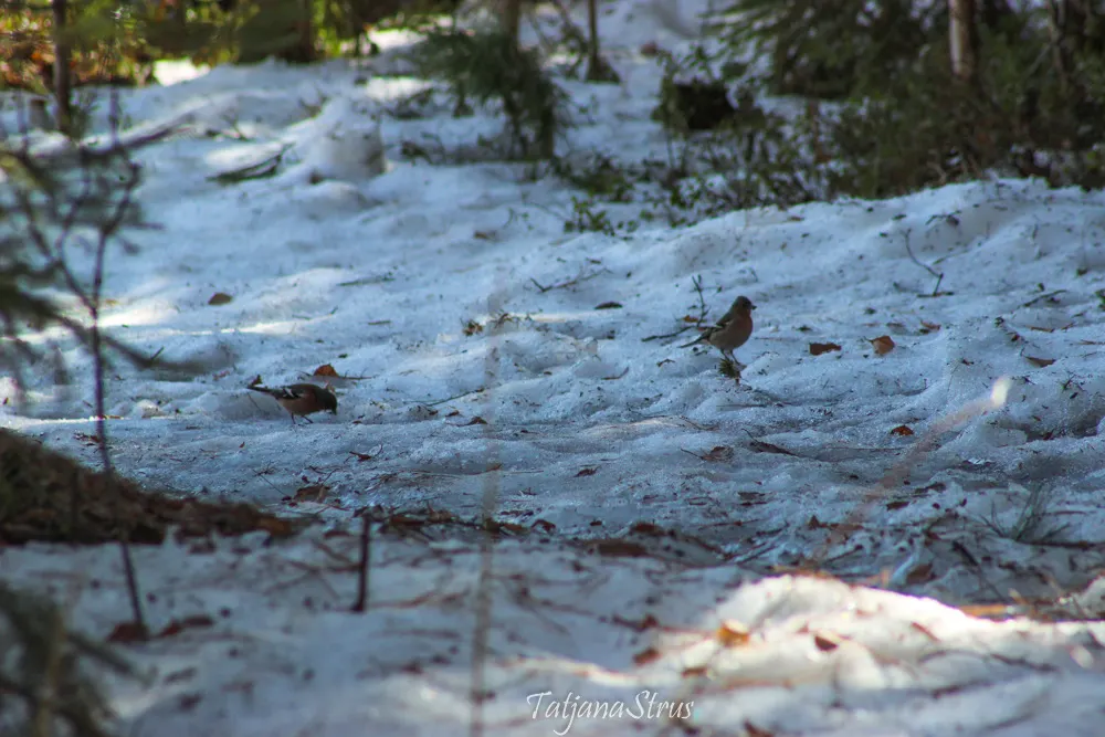 Вскоре, невдалеке от меня, пара зябликов опустилась на снежный покров и среди опавшей трухи начала отыскивать корм.