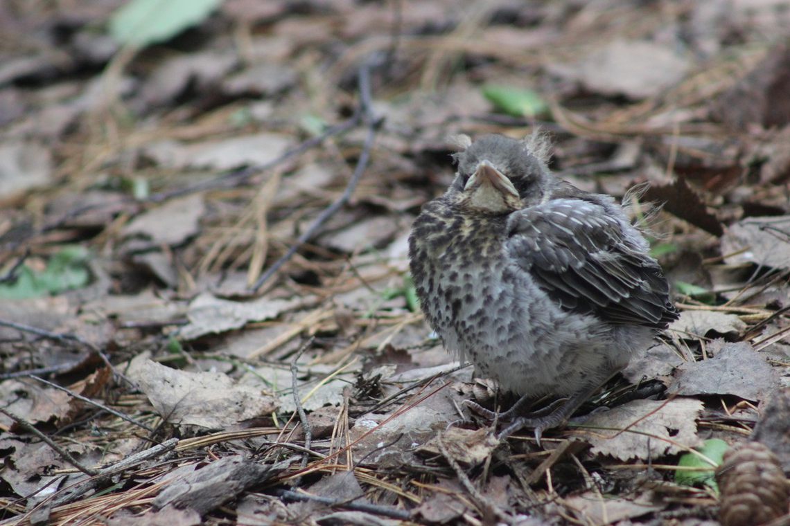 Шла по лесу и услышала громкий писк, непрестанно повторяющийся. Пройдя еще немного вперёд, увидела на лесной дороге слётка дрозда-рябинника. Тот, не обращая на меня внимания, громко пищал, давая знать...